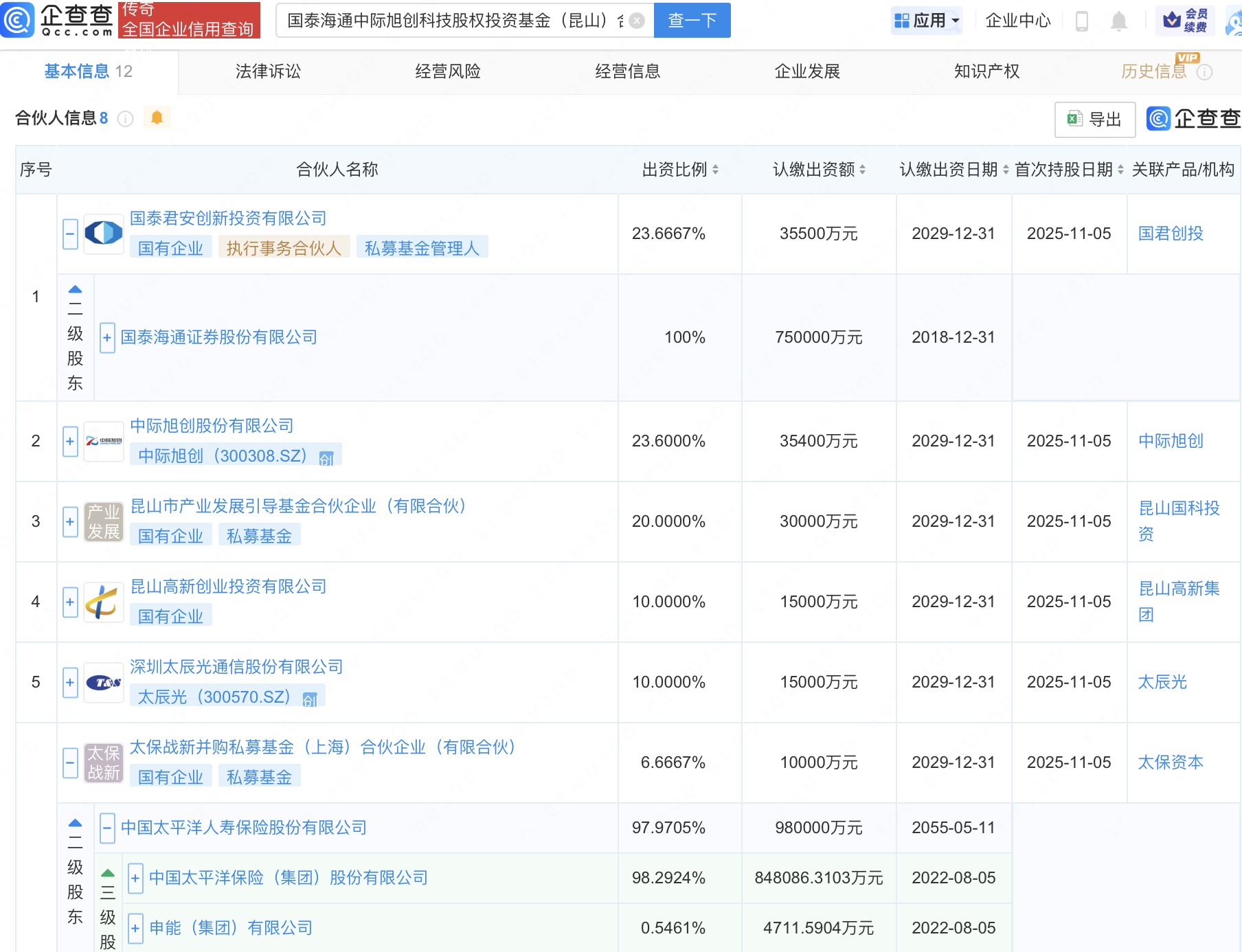 近日,国泰海通中际旭创科技股权投资基金(昆山)合伙企业(有限合伙)成立,出资额15亿元,经营范围包含:以私募基金从事股权投资、投资管理、资产管理等活动。企查查股权穿透显示,该企业由国泰海通(601211)旗下国泰君安创新投资有限公司、中际旭创(300308)、中国太保(601601)旗下太保战新并购私募基金(上海)合伙企业(有限合伙)、太辰光(300570)等共同出资。